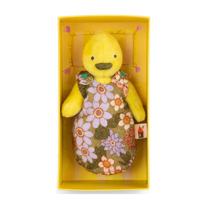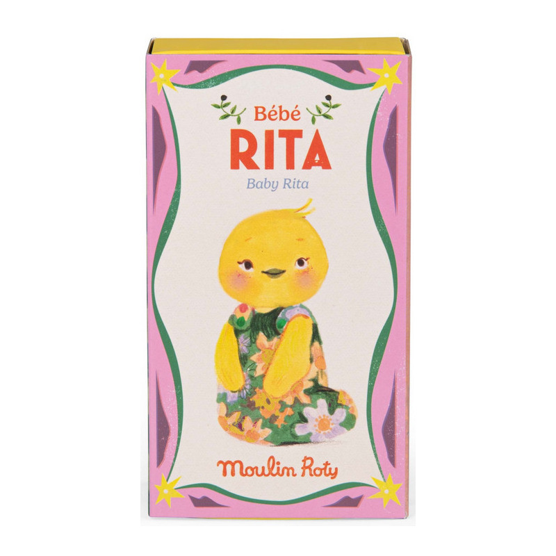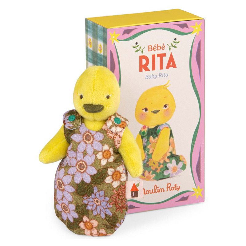 Kaczuszka Rita rozweseli niejednego maluszka. Ubrana jest w śpiworek z kwiatowym wzorem z dwoma ozdobnymi zielonymi kropkami, imitującymi guziki. Śpiworek jest zapinany na rzep i zdejmowany. Nóżki maskotki można zgiąć i ustawić ją w pozycji siedzącej. Maskotka jest zapakowana w pięknie ilustrowane, ozdobne pudełko.