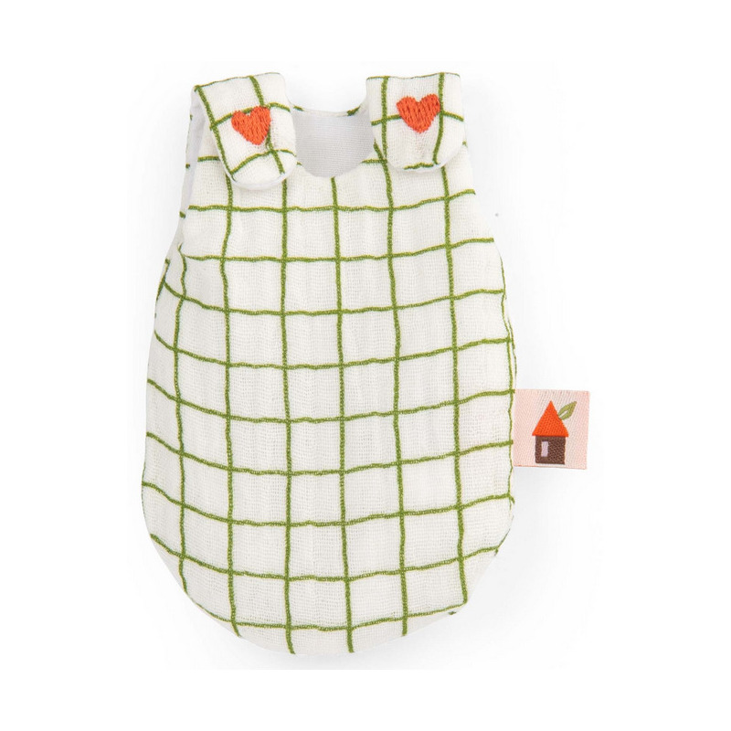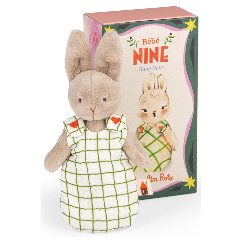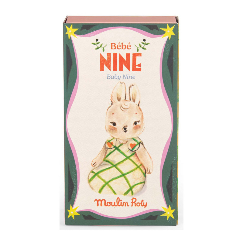 Króliczek Nine posiada mięciutkie długie uszy oraz uroczy pyszczek, który rozweseli niejednego maluszka. Ubrany jest w biały śpiworek w zieloną kratę z dwoma ozdobnymi serduszkami, imitującymi guziki. Śpiworek jest zapinany na rzep i zdejmowany. Nóżki maskotki można zgiąć i ustawić ją w pozycji siedzącej. Maskotka jest zapakowana w pięknie ilustrowane, ozdobne pudełko.