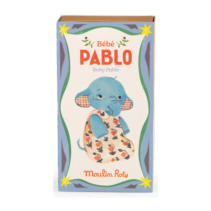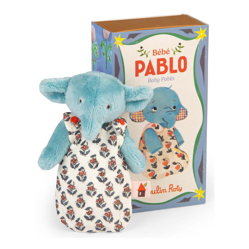 Słonik Pablo posiada mięciutkie uszy oraz uroczą trąbę, która rozweseli niejednego maluszka. Ubrany jest w śpiworek w kwiatowy wzór z dwoma ozdobnymi czerwonymi kółkami, imitującymi guziki. Śpiworek jest zapinany na rzep i zdejmowany. Nóżki maskotki można zgiąć i ustawić ją w pozycji siedzącej. Maskotka jest zapakowana w pięknie ilustrowane, ozdobne pudełko.