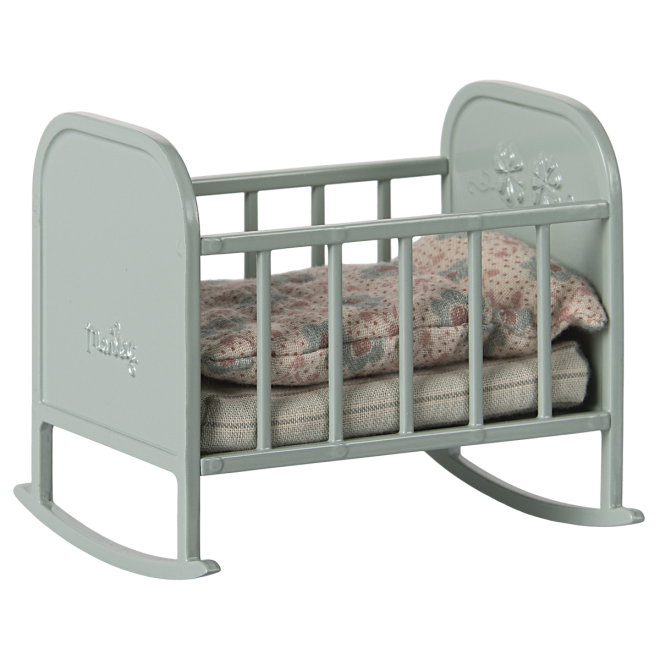 W niebieskiej kołysce w stylu vintage malutkie myszki Maileg będą mogły spać spokojnie. Pościel z miękkiego materiału zapewni ciepełko przez całą noc. Pięknie zaprojektowana kołyska z metalu ma małe wytłoczenie kwiatka na wezgłowiu i zaokrąglone nogi, dzięki czemu można kołysać maluchy do snu.