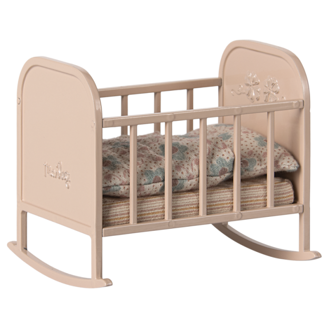 W różowej kołysce w stylu vintage malutkie myszki Maileg będą mogły spać spokojnie. Pościel z miękkiego materiału zapewni ciepełko przez całą noc. Pięknie zaprojektowana kołyska z metalu ma małe wytłoczenie kwiatka na wezgłowiu i zaokrąglone nogi, dzięki czemu można kołysać maluchy do snu.