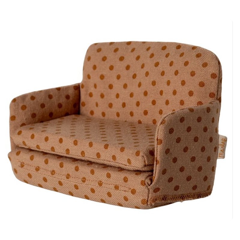 Kanapa w kropki to idealne miejsce odpoczynku po ciężkim dniu dla myszek Maileg. W ciągu dnia pełni rolę wygodnej sofy, a wieczorem łatwo można ją rozłożyć, aby stała się przytulnym łóżeczkiem- dzięki temu scenki z życia codziennego nabierają realizmu.