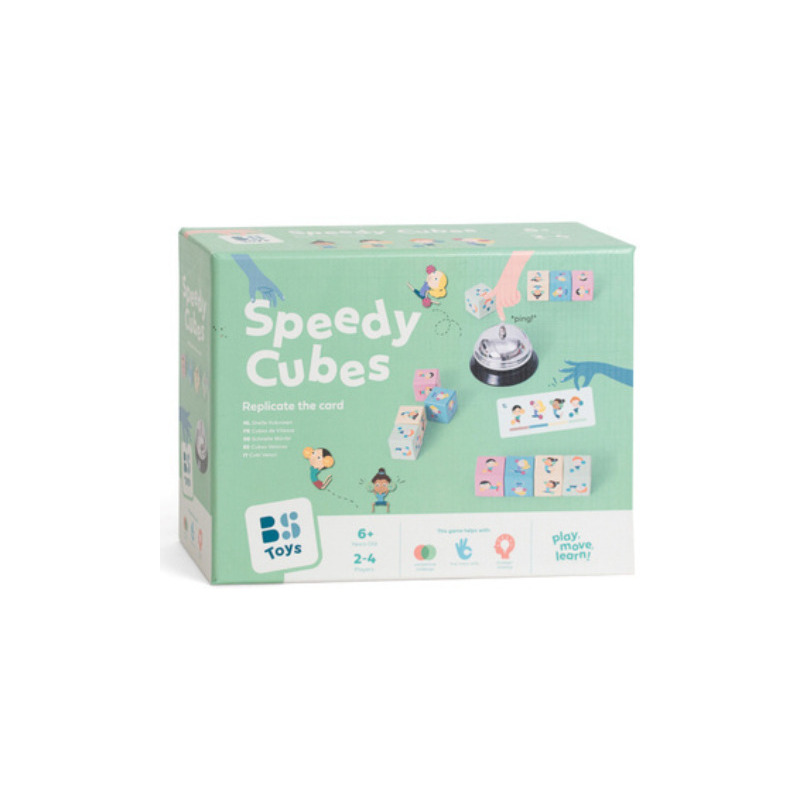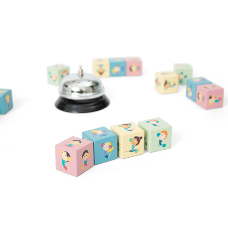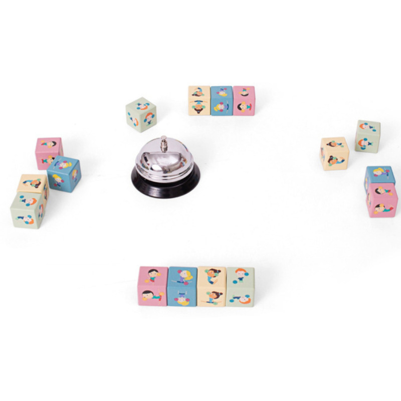 W zestawie: 16 kostek (3 x 3 cm), 1 dzwonek (8,5 cm), 30 kart (5 x 12 cm).