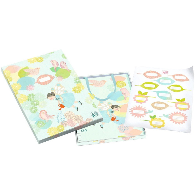 W zestawie znajdują się wielorazowe naklejki do zapisywania imion dzieci, wieku i dat.