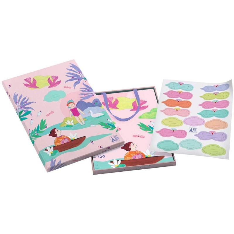 W zestawie znajdują się wielorazowe naklejki do zapisywania imion dzieci, wieku i dat.