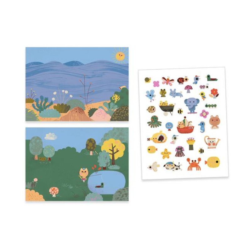 Zestaw naklejek wielokrotnego użytku wraz z malowniczymi planszami do tworzenia wakacyjnych scenek zapewnią Maluchom mnóstwo zabawy! Dwa duże tła przedstawiające morze i plażę oraz łąkę nad jeziorem czekają na ozdobienie naklejkami ze zwierzątkami i roślinkami. Do wyboru 30 wypukłych naklejek. Dzieci mogą zmieniać ułożenie elementów dowolną ilość razy.