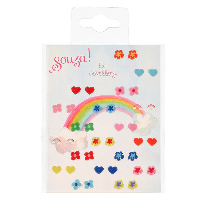 Zestaw kolczyków samoprzylepnych marki Souza, w którego skład wchodzi 38 sztuk (19 par) drobnych kolczyków w różnych kolorach i kształtach – serduszek, kwiatów oraz tęczy.