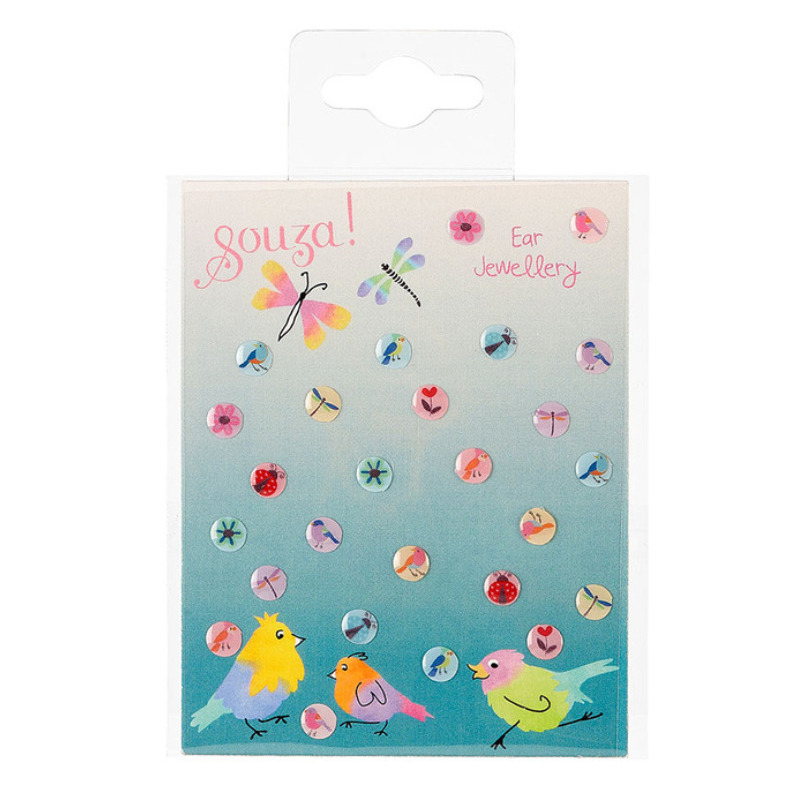 Zestaw kolczyków samoprzylepnych marki Souza, w którego skład wchodzi 26 sztuk drobnych okrągłych kolczyków z różnymi kolorowymi motywami, m. in. kwiatami, owadami czy ptaszkami.