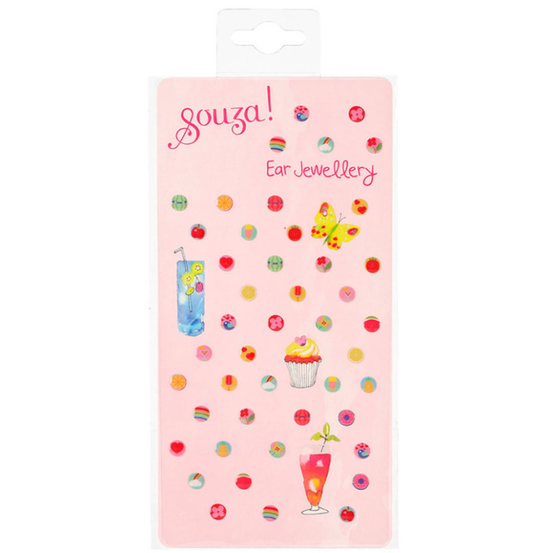 Zestaw kolczyków samoprzylepnych marki Souza, w którego skład wchodzi 45 sztuk drobnych okrągłych kolczyków z różnymi kolorowymi motywami, m. in. owocami.