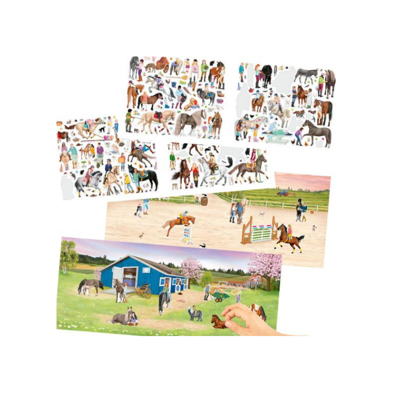Rewelacyjny zestaw naklejek z planszami to nieskończone możliwości tworzenia własnych historii z końmi w roli głównej! W zestawie znajdują się plansze z różnymi sceneriami przedstawiające życie koni oraz mnóstwo naklejek z konikami i akcesoriami.