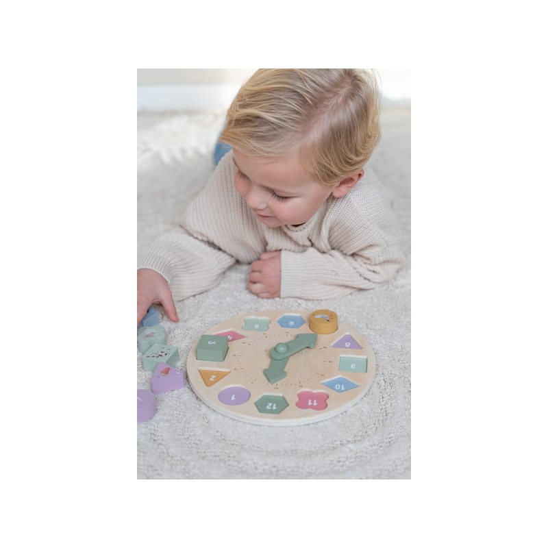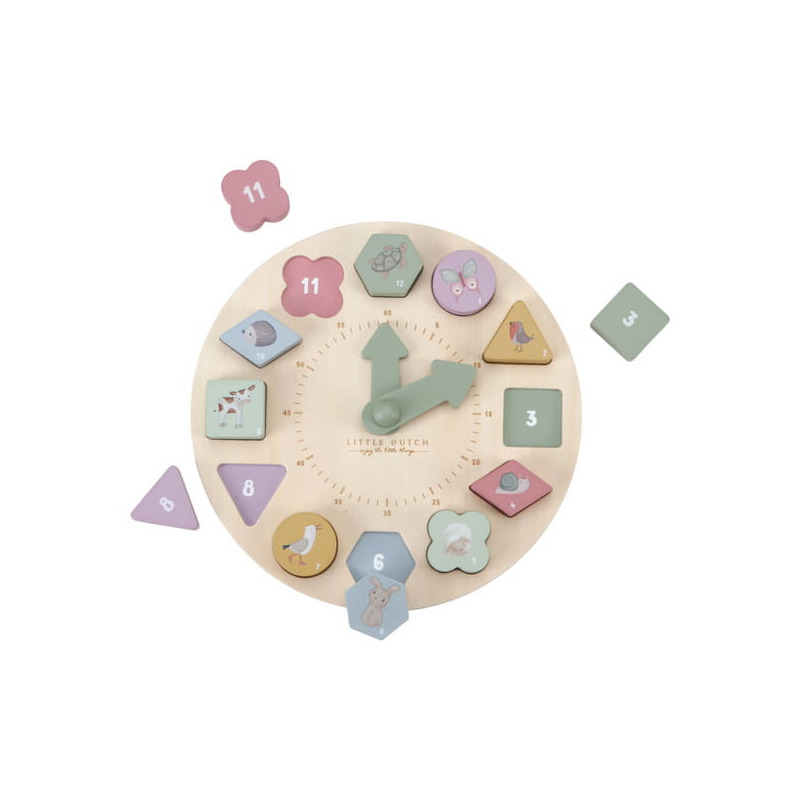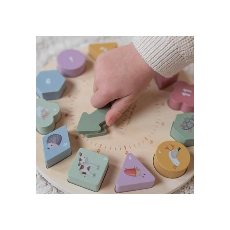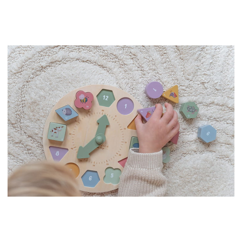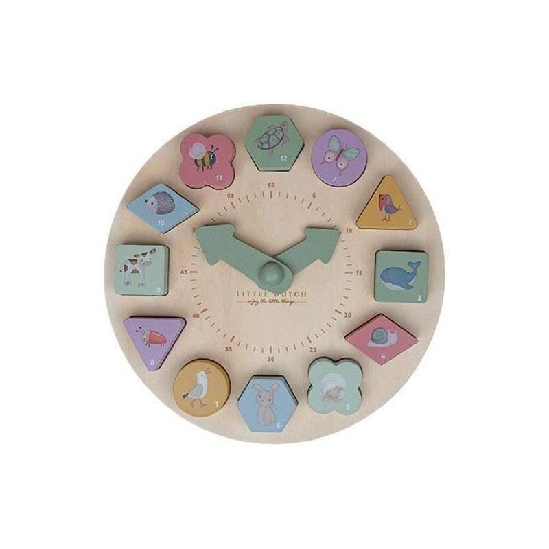 Drewniany zegar do nauki czasu to świetna zabawa i nauka w jednym. Zegar posiada ruchome wskazówki i zawiera 12 kostek liczbowych o różnych kształtach, które mieszczą się w dopasowanych przegródkach na tarczy.