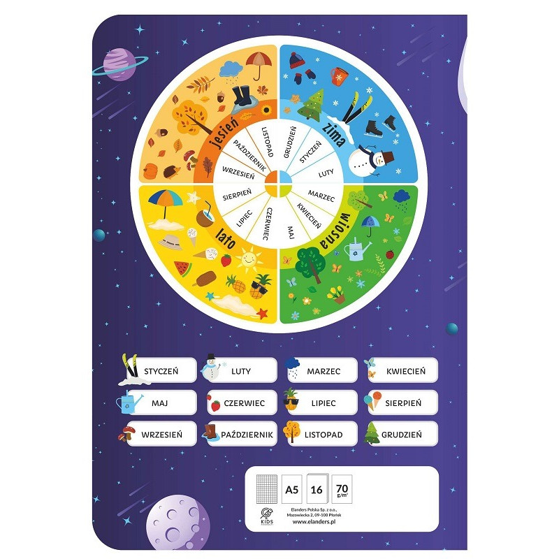 Zeszyt w kratkę przyda się w domu oraz w szkole. Mogą posłużyć, jako pamiętniki lub zeszyty do notatek. Wyróżnia go grafika z motywem Kosmosu.