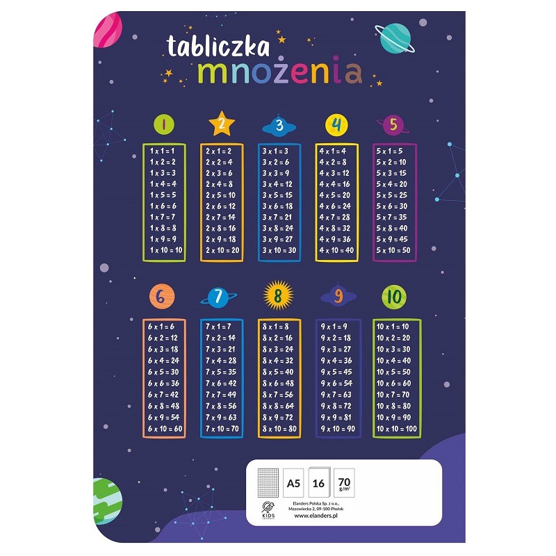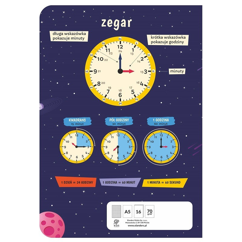 Z tyłu zeszyt posiada grafikę z tabliczką mnożenia, zegarem lub porami roku.