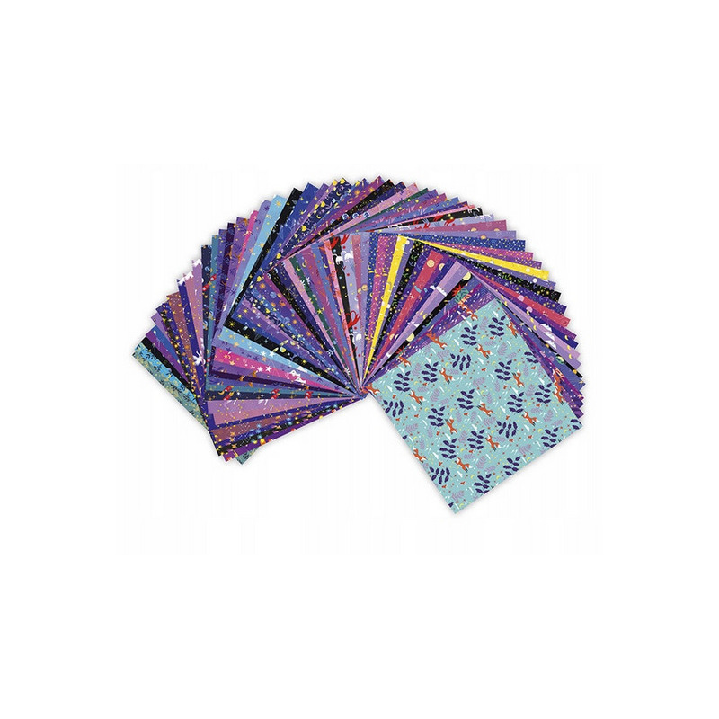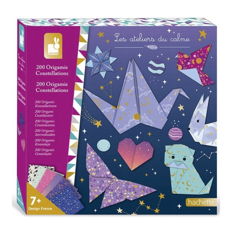 Zestaw kreatywny do tworzenia origami Konstelacje marki JANOD zawiera 200 szt. kwadratowych arkuszy ozdobnego papieru (część z efektem metalicznym) o wymiarach 17,5 x 17,5 cm lub 14 x 14 cm. Po odpowiednim złożeniu papieru, zgodnie z załączoną instrukcją, mogą z nich powstać m.in. gwiazda, kot, serce, żuraw, motyl, kot czy koń (w sumie 15 różnych figur).