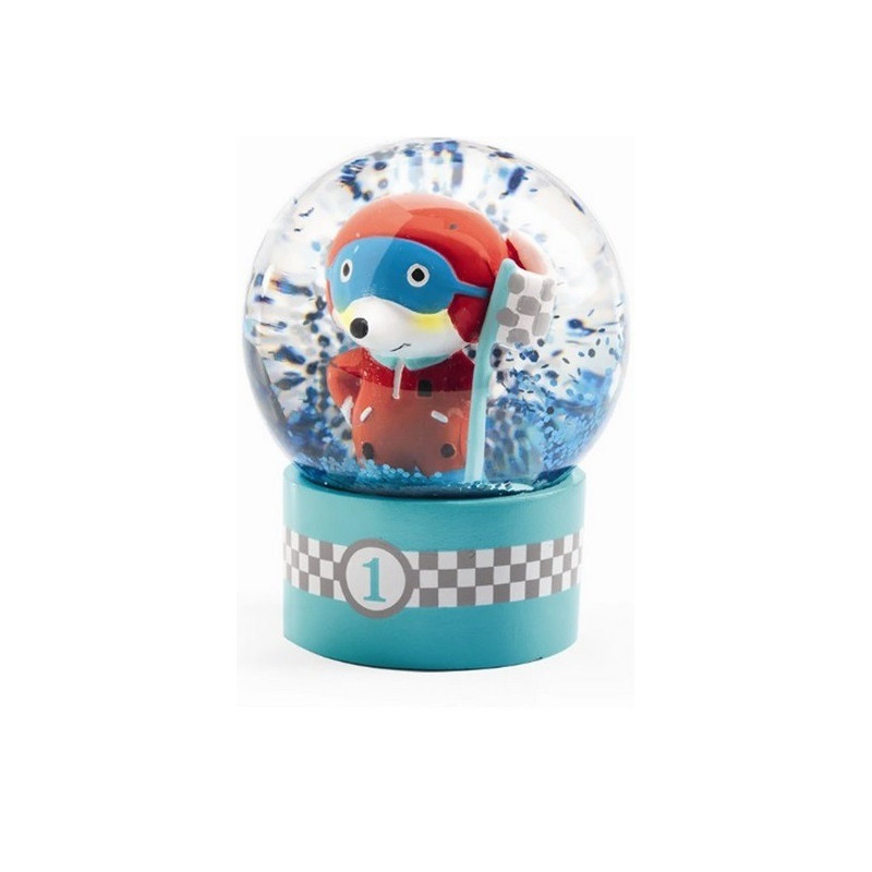 W kuli znajduje się uroczy miś ubrany w czerwony strój rajdowy.