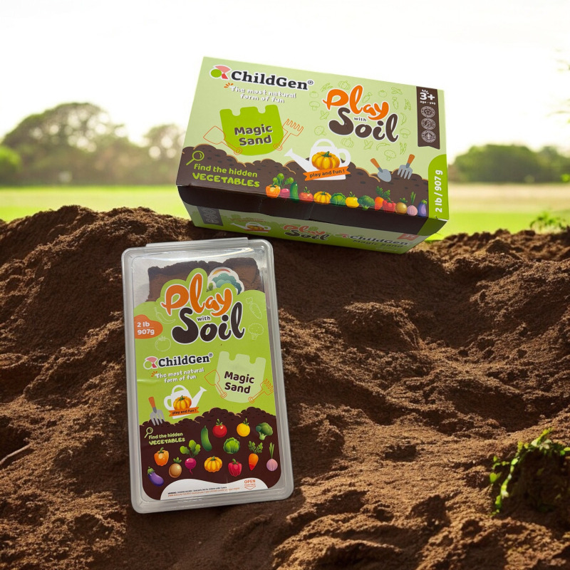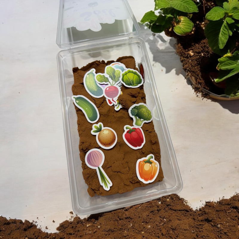 Zabawa w poszukiwanie warzyw i owoców w glebie z pewnością wciągnie maluchy na długie godziny! Zwłaszcza, że gleba to tak na prawdę piasek kinetyczny, nie brudzi rąk i ma przyjemną konsystencję! Twoje dziecko może bawić się jak prawdziwą ziemią, ale bez brudu i alergenów,. Nazywanie odkrytych owoców i warzyw to świetny sposób na pierwsze kroki w nauce o zdrowym odżywianiu.
