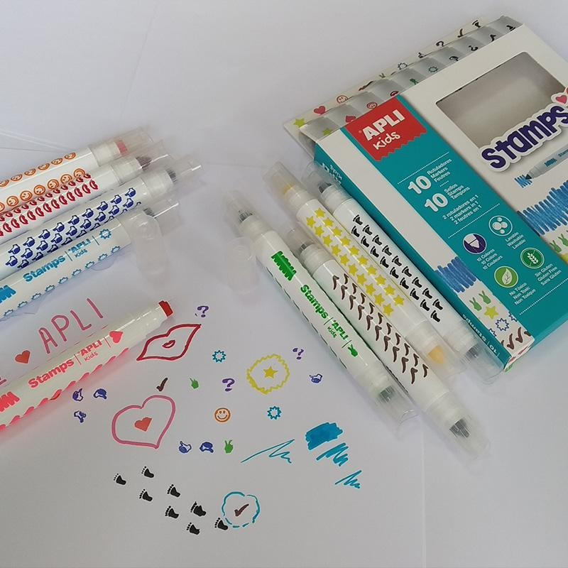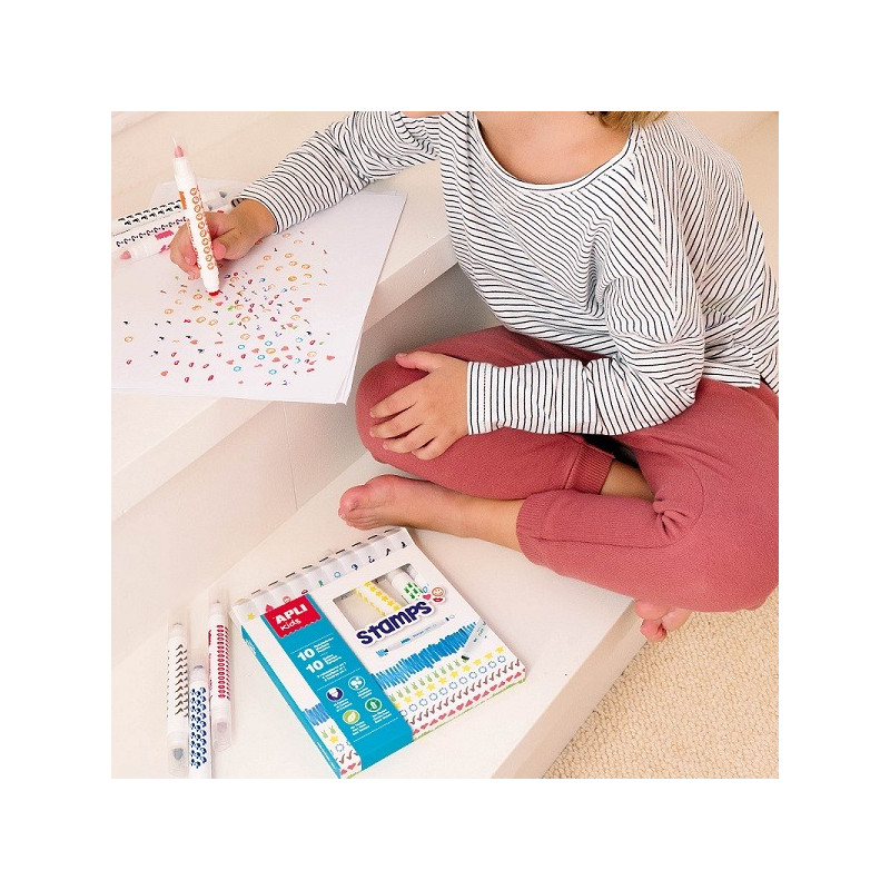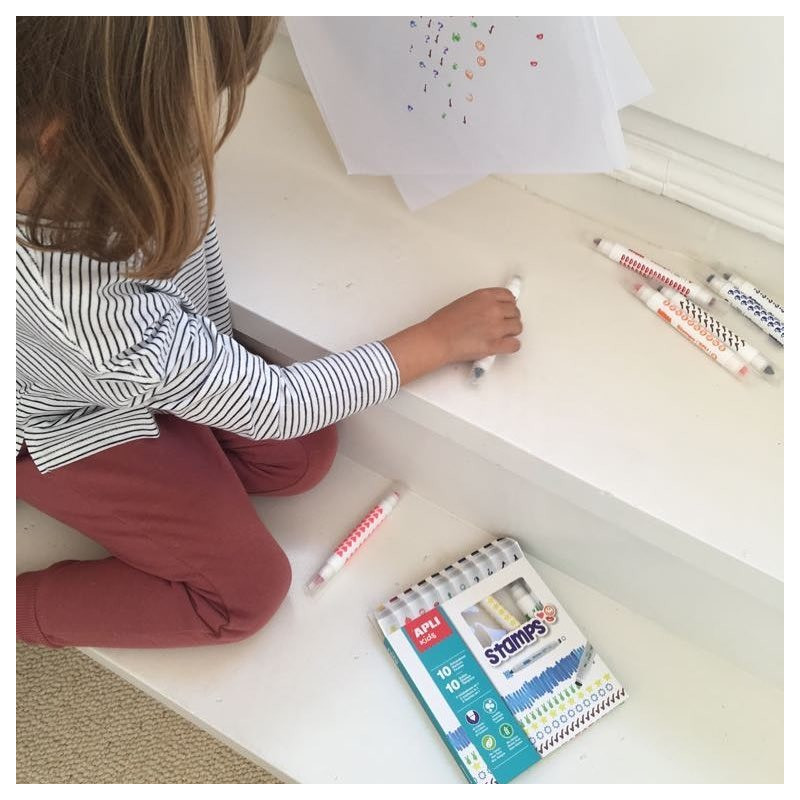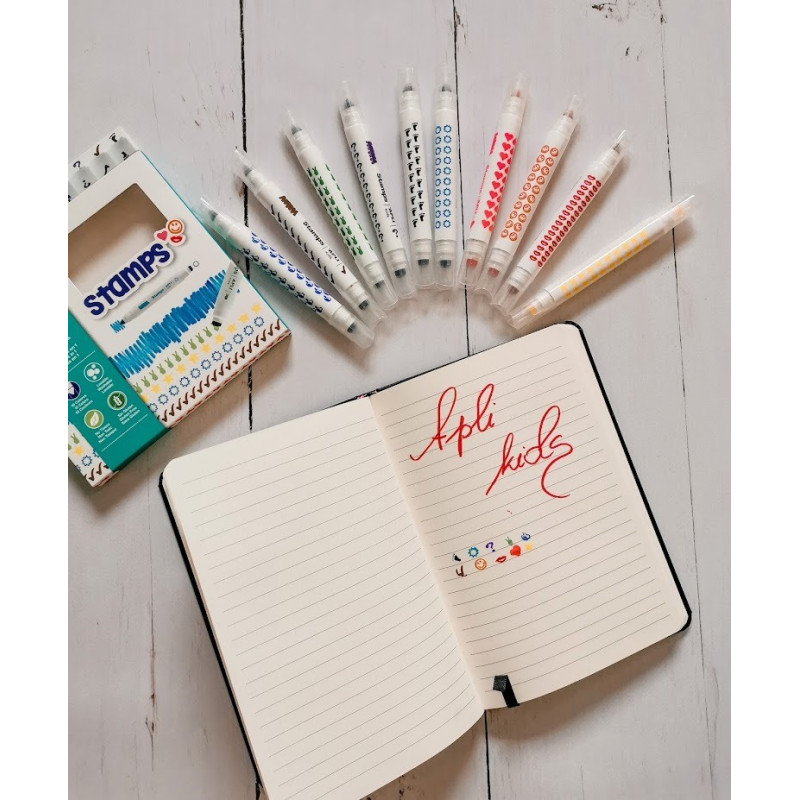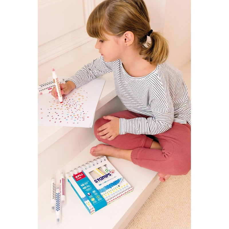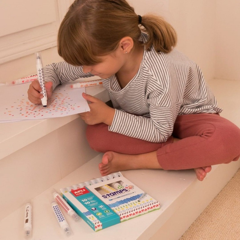 Zestaw zawiera 10 flamastrów ze stempelkami, każdy w grubej oprawce,