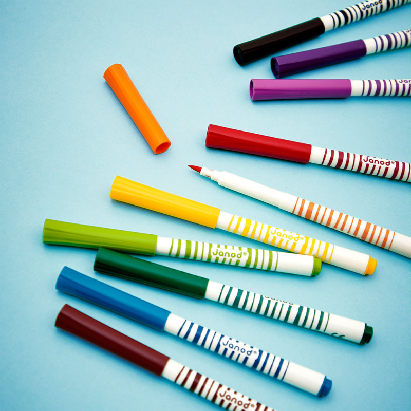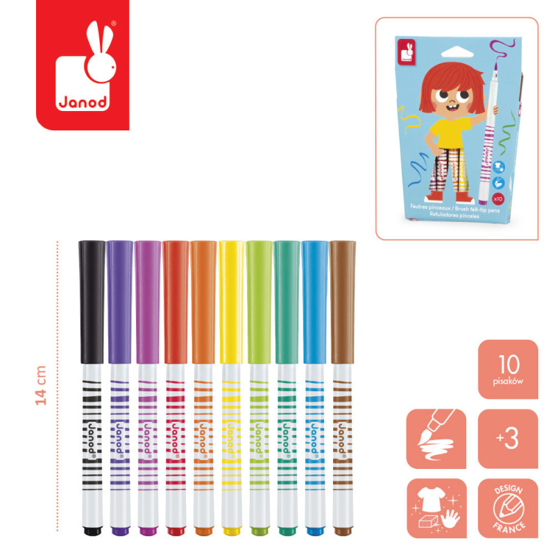 Zestaw 10 flamastrów pędzelkowych marki JANOD w pięknych, intensywnych kolorach. Są poręczne, z okrągłymi uchwytami. Mają mięciutką filcową końcówkę, przypominającą pędzelek i długie zatyczki.