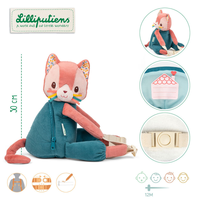 Uroczy miękki plecaczek w kształcie Kotki Jeanne belgijskiej marki Lilliputiens. Funkcjonalny, lekki i wygodny. Idealny dla maluchów, do przedszkola i na krótkie wycieczki. Jest zapinany na suwak, ma łapki z szelkami z regulacją długości oraz dodatkowy pasek stabilizujący i odciążający plecy, zapinany na łatwy w obsłudze zatrzask. A także: sterczące uszka i wąsy oraz długi ogon.