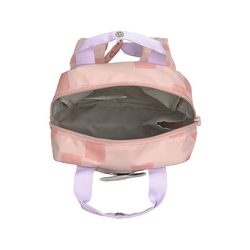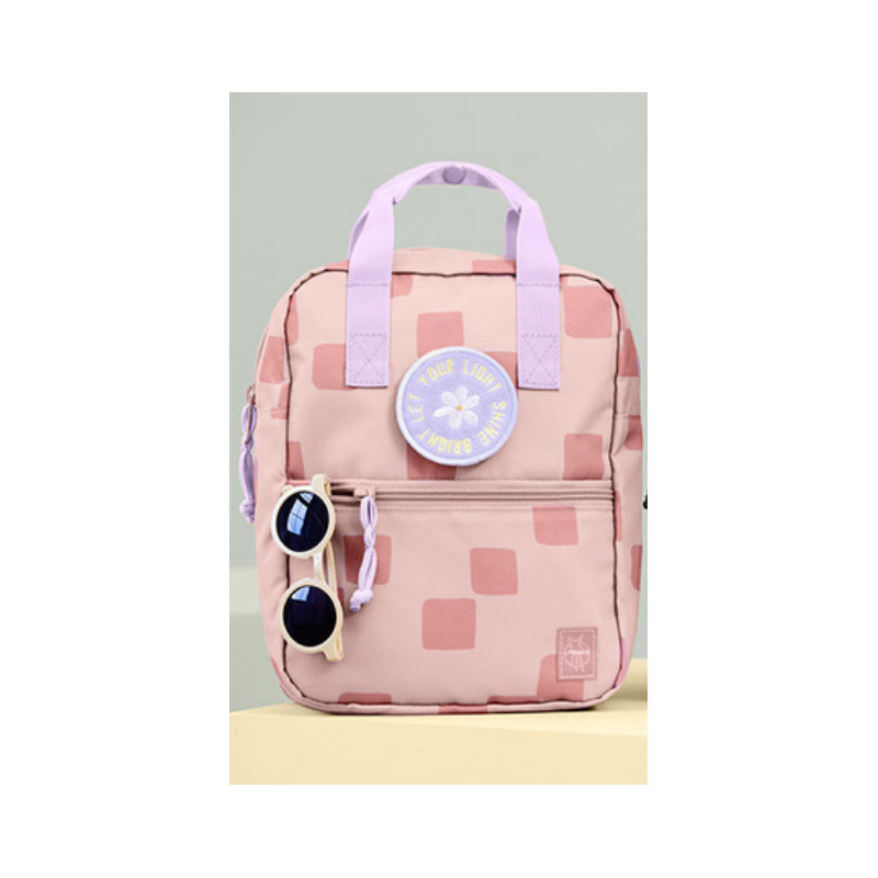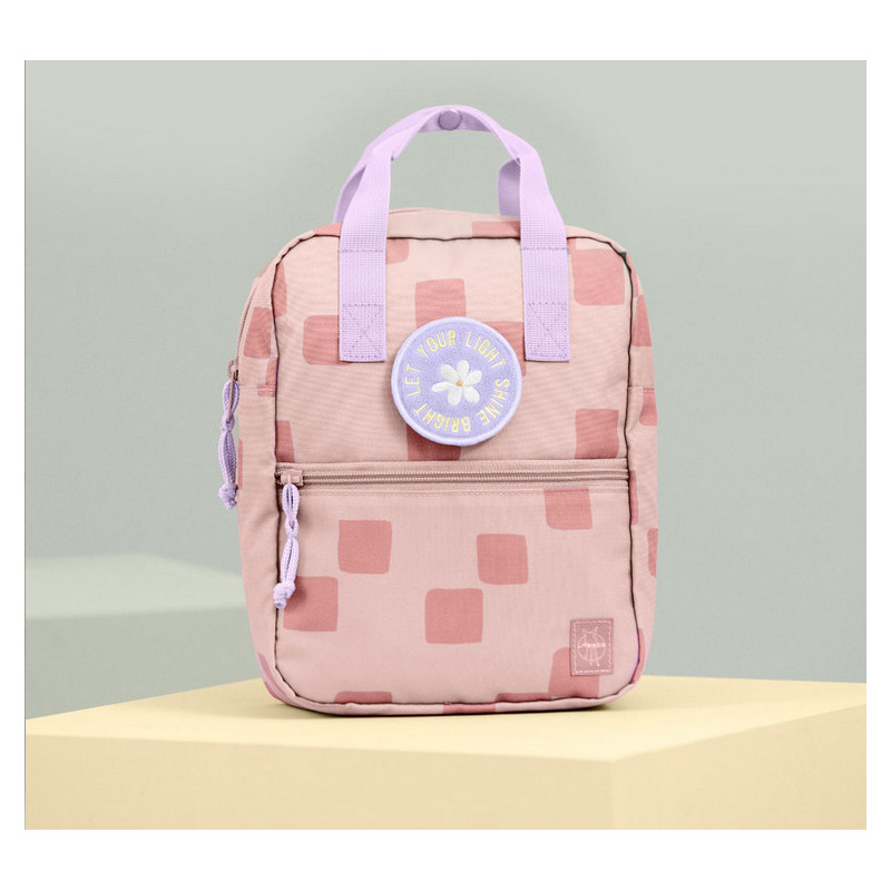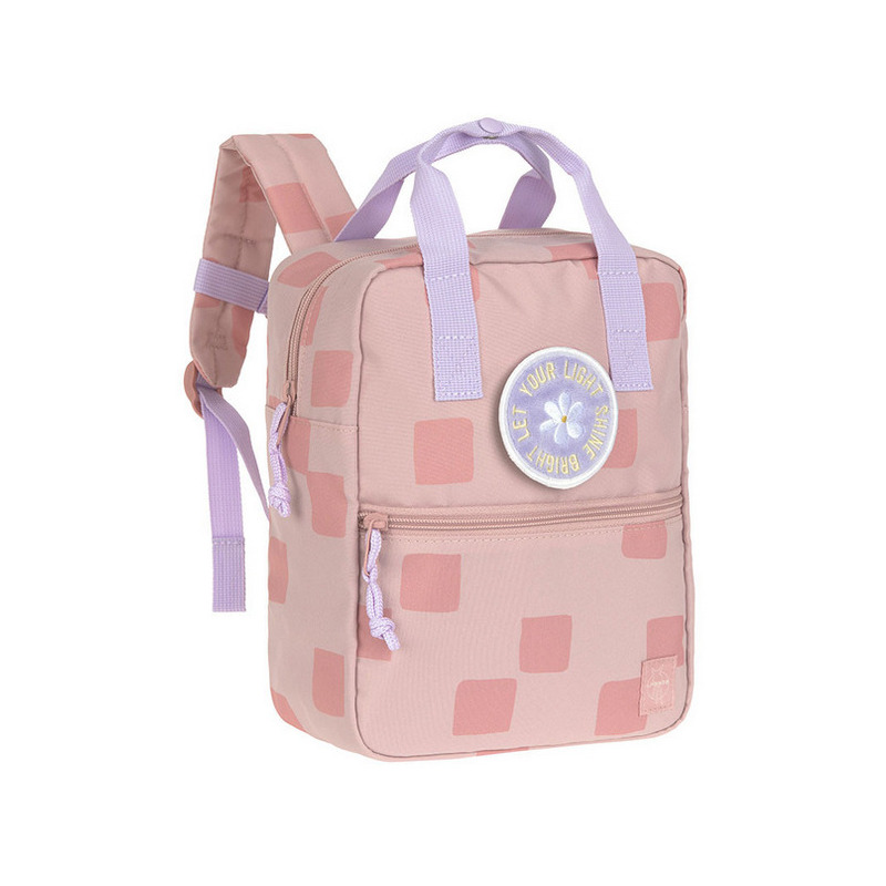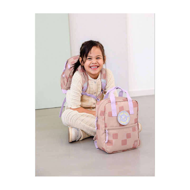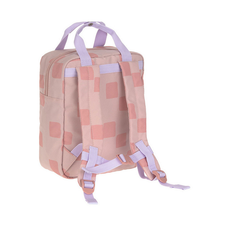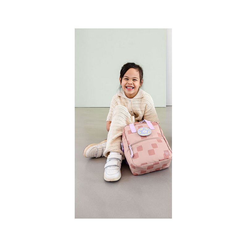 Funkcjonalny, uroczy kwadratowy plecak niemieckiej marki LASSIG. Sprawdzi się do przedszkola, jak i podczas wycieczek. Jest lekki, wygodny, o optymalnej pojemności 7 l. Zwraca uwagę niebanalną kolorystyką – jest pudrowo-różowy w kwadraciki z liliowymi detalami.