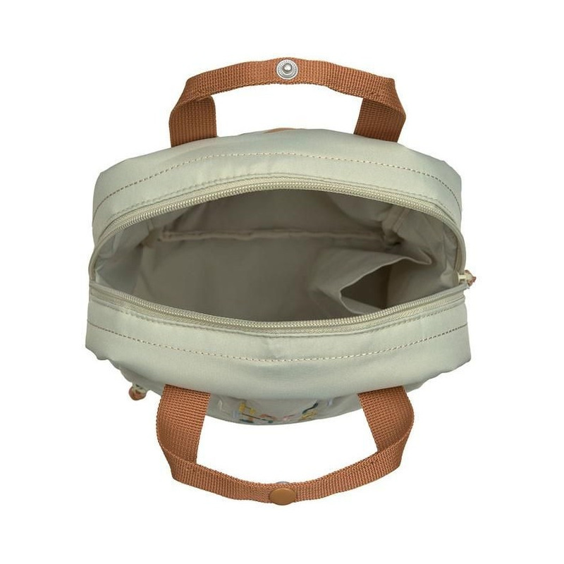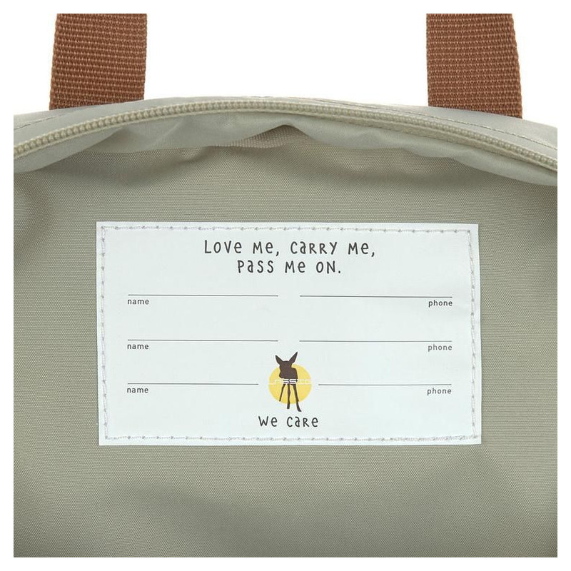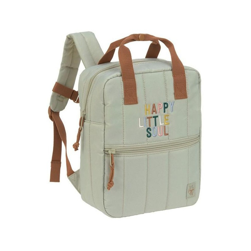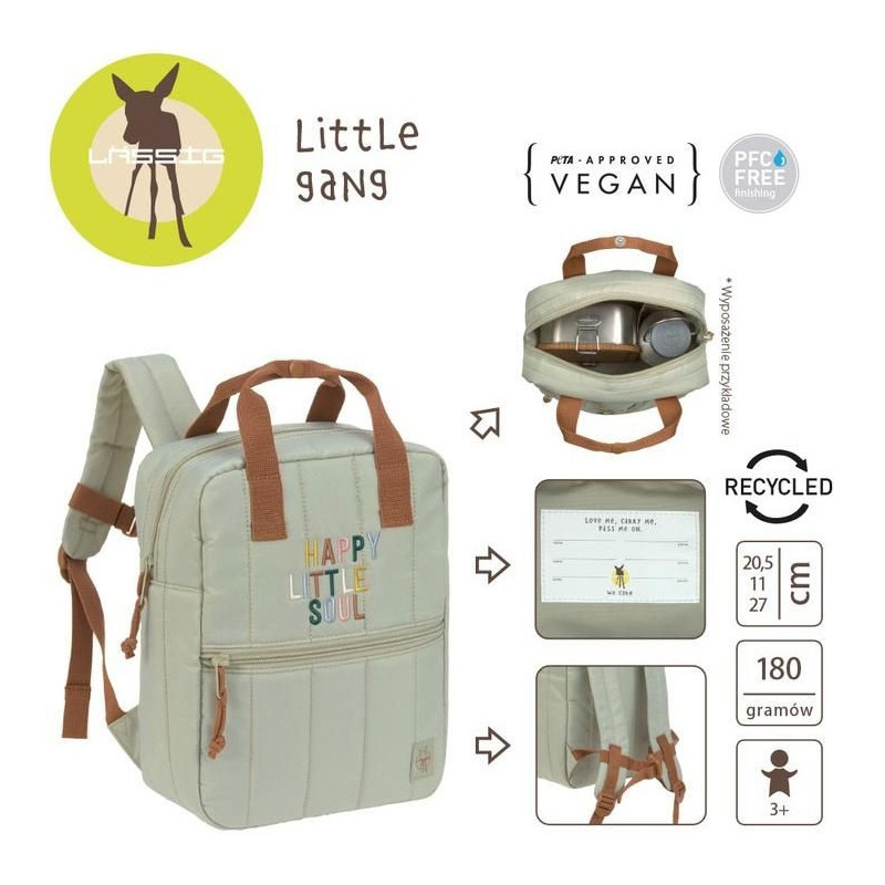 Funkcjonalny mini plecak marki LASSIG sprawdzi się zarówno do przedszkola, jak i podczas wycieczek. Jest lekki, wygodny, o optymalnej pojemności 7l. Plecak wyróżnia się nietuzinkową kolorystyką: jasny khaki materiał kontrastuje z karmelowymi detalami, takimi jak rączki, regulowane pasy czy ozdobne sznureczki przy suwakach. Z przodu znajduje się uroczy kolorowy napis „Happy Little Soul”. Materiał plecaka jest łatwy w czyszczeniu i odporny na wilgoć.
