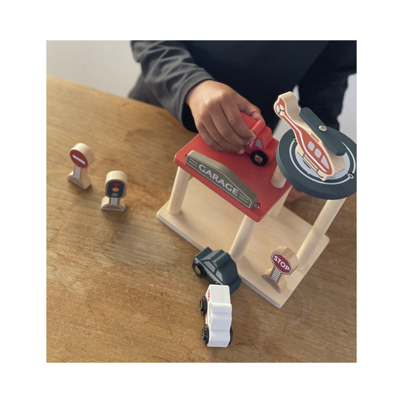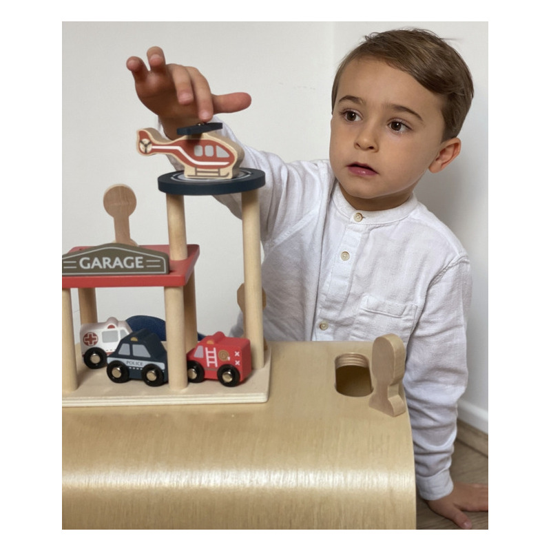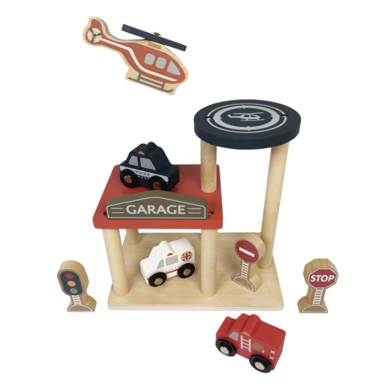 W tym zestawie znajduje się wszystko, czego potrzeba, by stworzyć własną, pełną akcji strefę ratunkową: przestronny garaż oraz cztery pojazdy – samochód policyjny, karetka pogotowia, wóz strażacki i helikopter, a także znaki drogowe. Każdy element jest starannie wykonany z drewna, co zapewnia trwałość i bezpieczeństwo.
