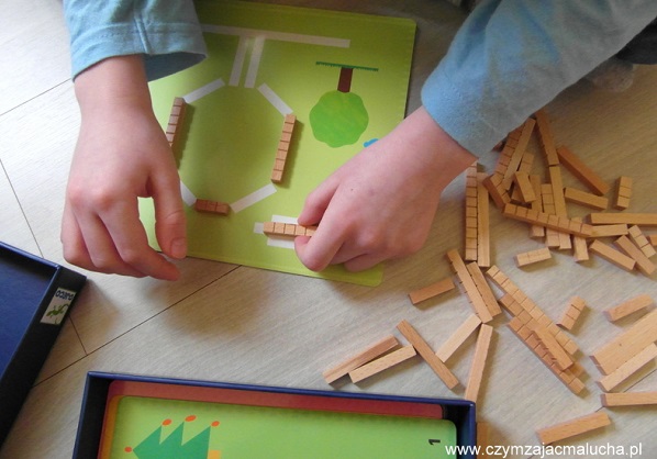 Ciekawą opcją są także drewniane patyczki, które Maluchy układają na planszach według wzoru. Stworzenie płaskich konstrukcji może posłużyć również do tworzenia historii i opisów.