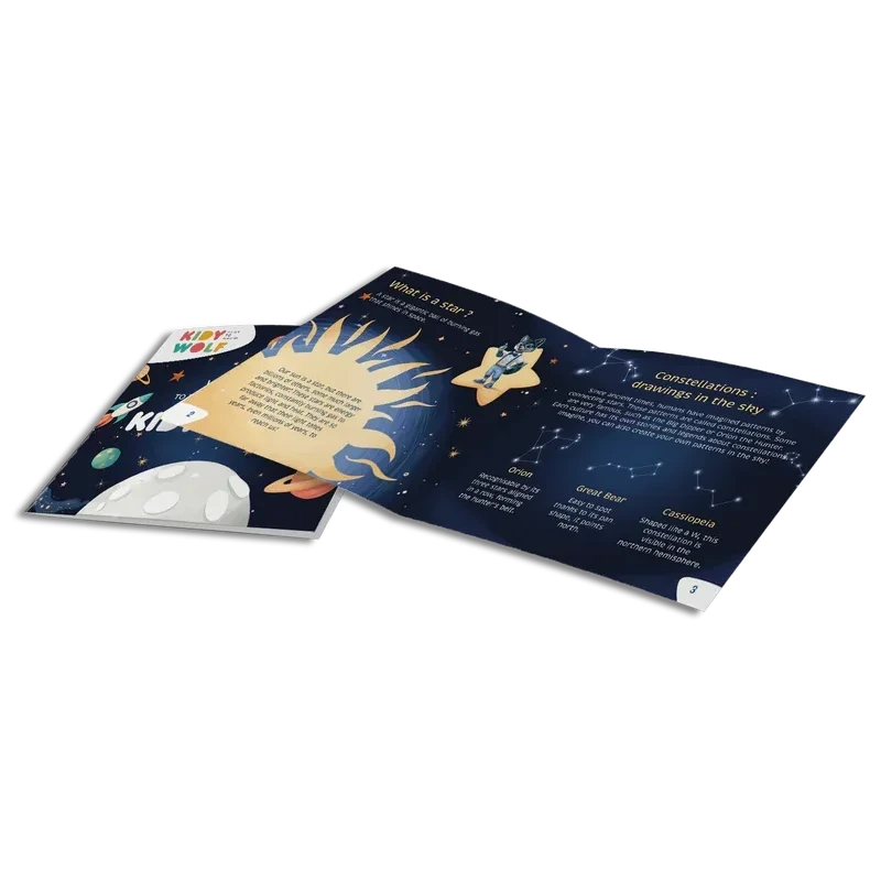 Dołączona broszura edukacyjna pomaga maluchom poznać podstawy astronomii, rozwijając ich zainteresowania i wyobraźnię. KidyStar to idealny towarzysz wieczornego wyciszenia i spokojnego zasypiania.