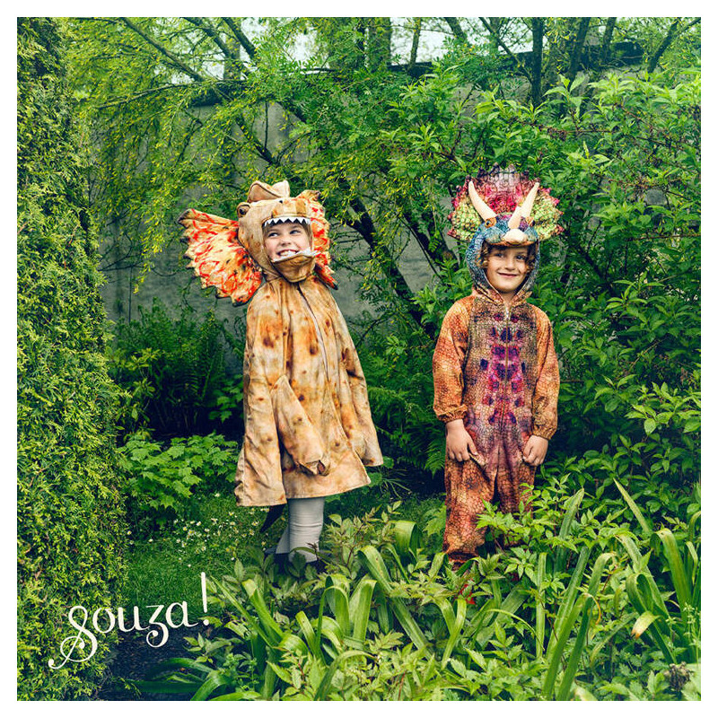 Kostium jest wielokolorowy, z nadrukowaną fakturą, imitującą skórę dinozaura.