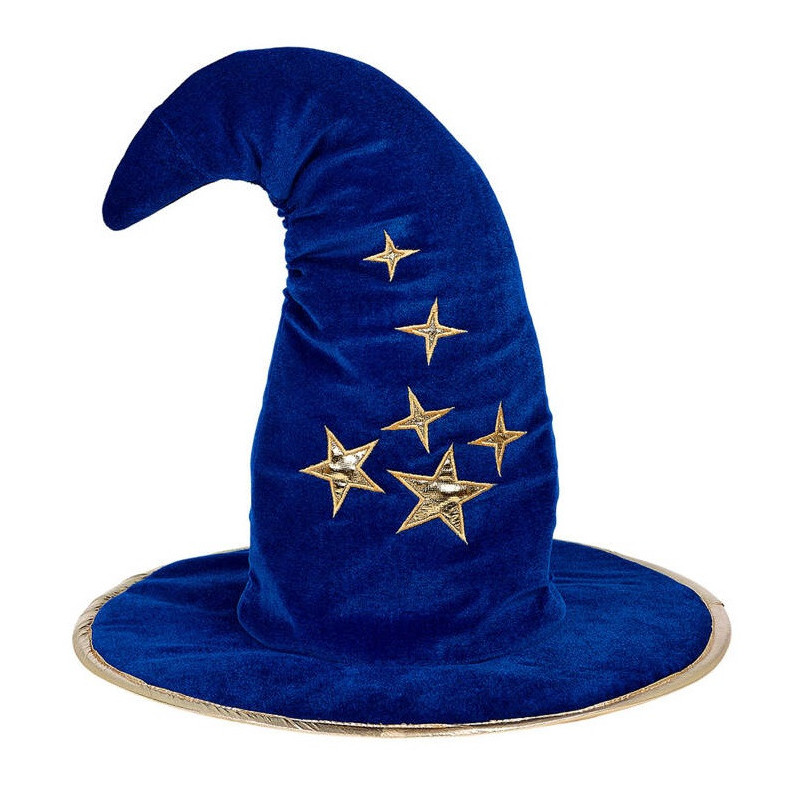 Kapelusz magika Wilfred to wysoki, trójkątny kapelusz z rondem i zagiętym czubkiem.