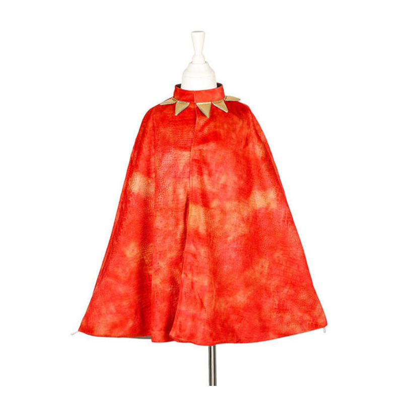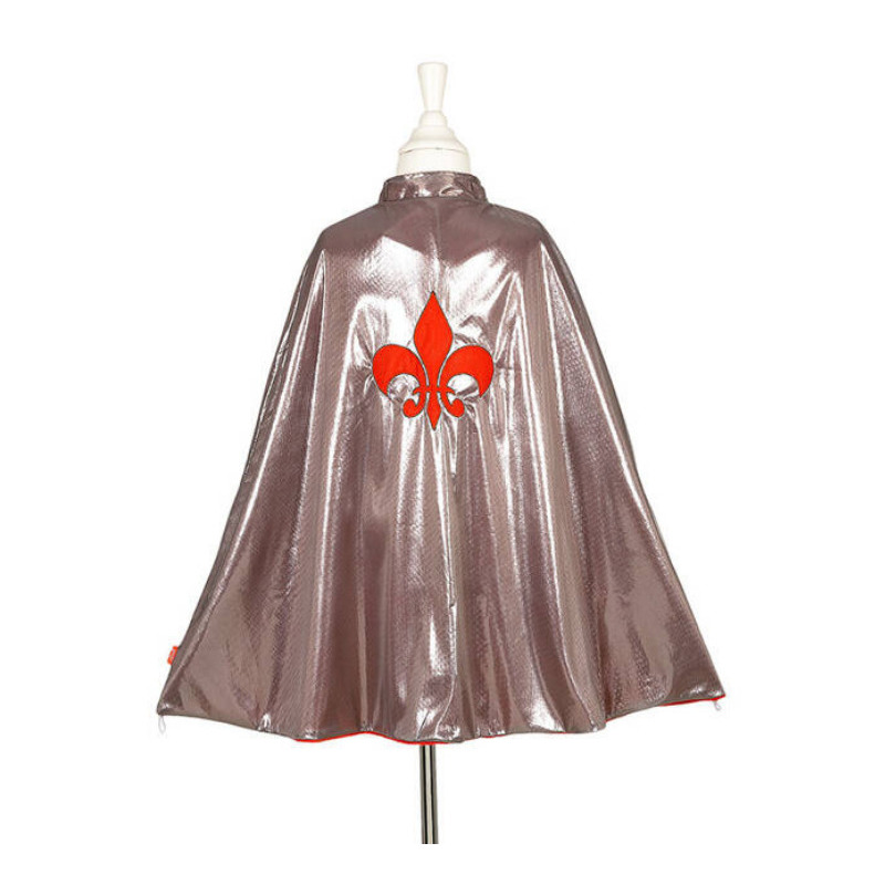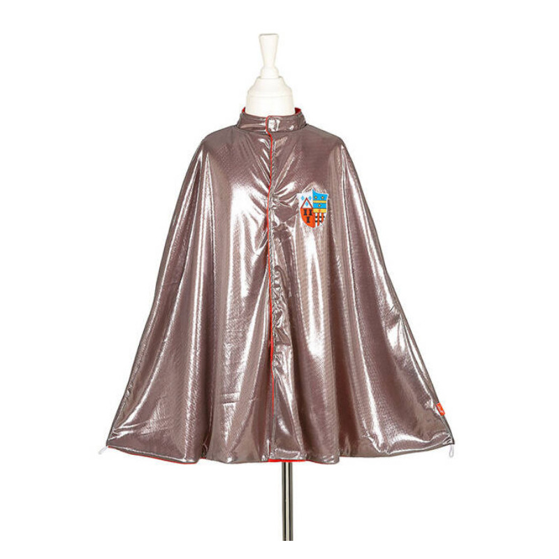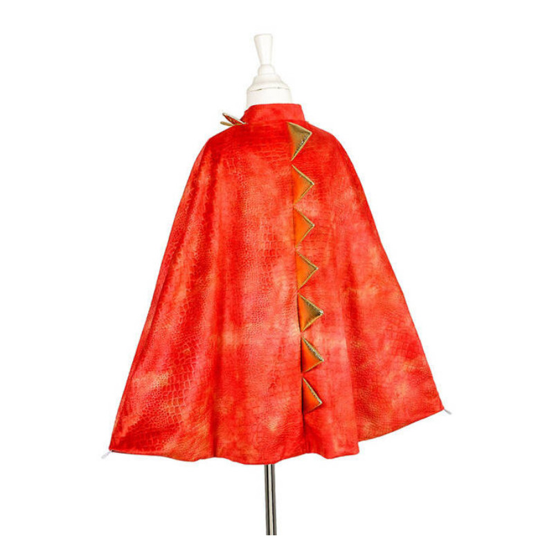 Kostium peleryna rycerza Czerwony Smok to przepiękne przebranie dla chłopca. Peleryna jest z jednej strony intensywnie czerwona, z fakturą i nadrukiem, imitującym ognistą smoczą skórę, a wokół szyi oraz wzdłuż pleców ma złote wypustki. Druga strona peleryny jest srebrna z rycerskim herbem na piersi i na plecach.