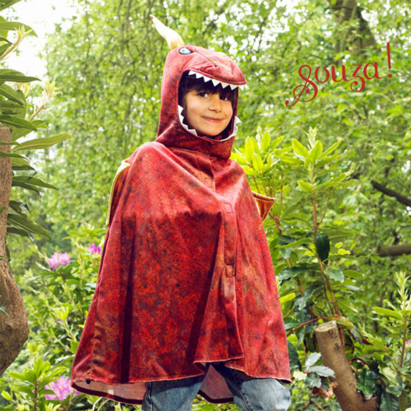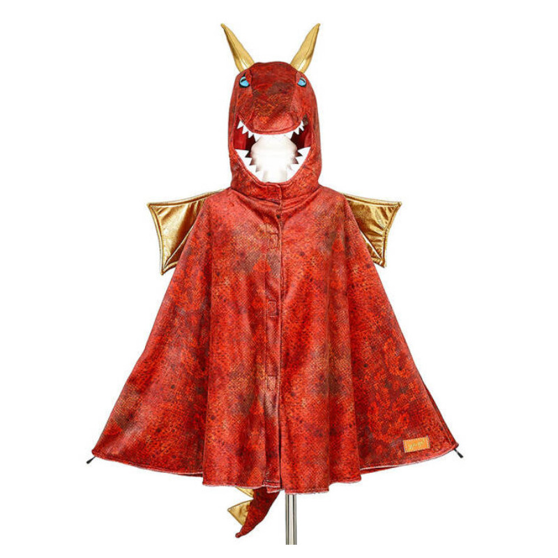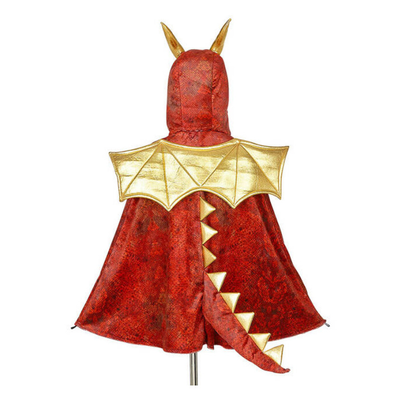 Kostium peleryna Czerwony Smok z dużym zabudowanym kapturem, tworzącym jednocześnie maskę smoka to przepiękne przebranie dla chłopca. Ma krótszą warstwę zewnętrzną – złote skrzydła, a wzdłuż całego grzbietu i na ogonie złote wypustki 3D.