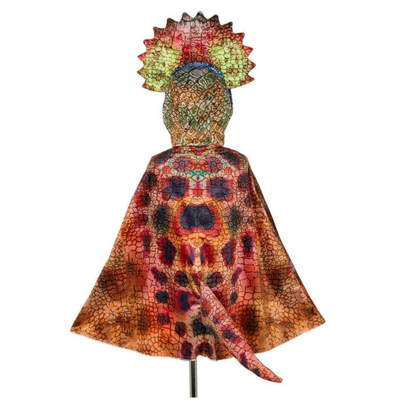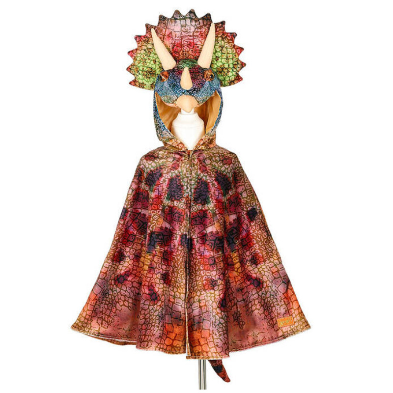 Kostium peleryna Triceratops z dużym zabudowanym kapturem, tworzącym jednocześnie maskę dinozaura to przepiękne przebranie dla chłopca. Ma wysoki imponujący grzebień, cztery rogi (dwa większe po bokach i dwa mniejsze z przodu) oraz gadzie oczy, a z tyłu – gruby ogon. Jest wielokolorowy, z nadrukowaną fakturą, imitującą skórę dinozaura.