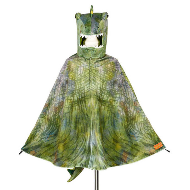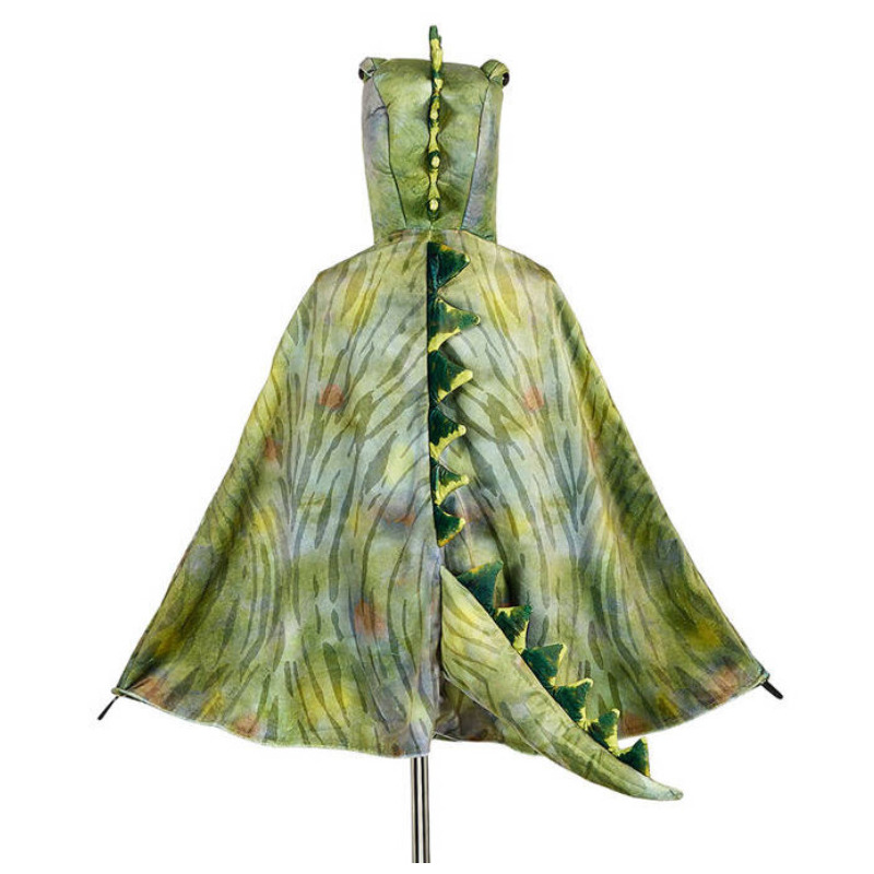 Kostium peleryna zielony T-rex z dużym zabudowanym kapturem, tworzącym jednocześnie maskę dinozaura to przepiękne przebranie dla chłopca. Od czubka głowy wzdłuż całego grzbietu ma wypustki 3D,