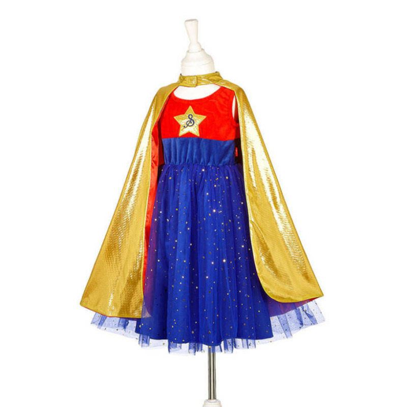Kostium sukienka z peleryną Superbohaterka to przepiękne przebranie dla dziewczynki. Sukienka ma klasyczny krój, czerwono-granatową aksamitną górę na szerokich ramiączkach, aplikację złotej gwiazdy, gumkę w pasie i rozkloszowany tiulowy dół w kolorze granatowym z drobinkami brokatu. Złota peleryna ma czerwoną podszewkę i aplikację czerwonej gwiazdy na plecach.