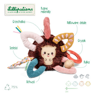 Soczyste kolory, oczka i zabawne nóżki zaciekawią dziecko.