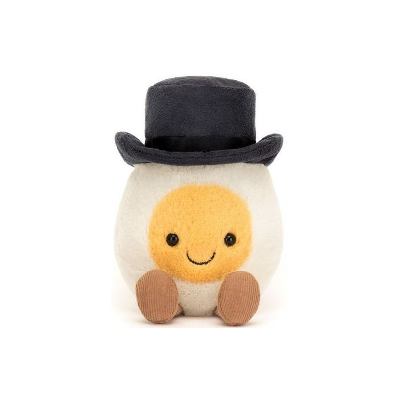 To urocze jajko ma futerko w kolorze kremowym, żółtą buźkę, czarny, elegancki cylinder, mięciutki brzuszek i sztruksowe stópki.
