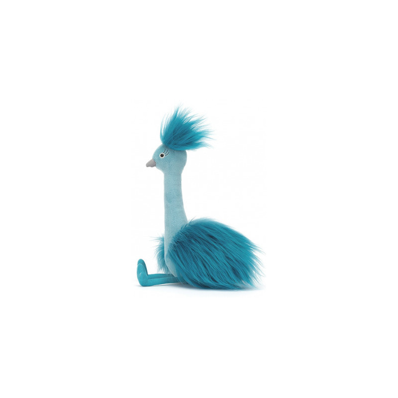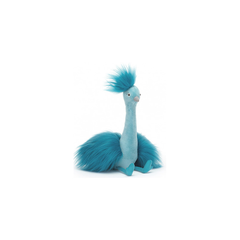 Paw to bardzo przyjemny w dotyku pluszak, który ma wspaniałe jedwabiste upierzenie w kolorze turkusowym, fantazyjne rzęsy, uroczy dziubek, długą szyję i długie zamszowe stópki. Można się z nim bawić i przytulać.