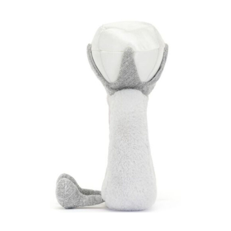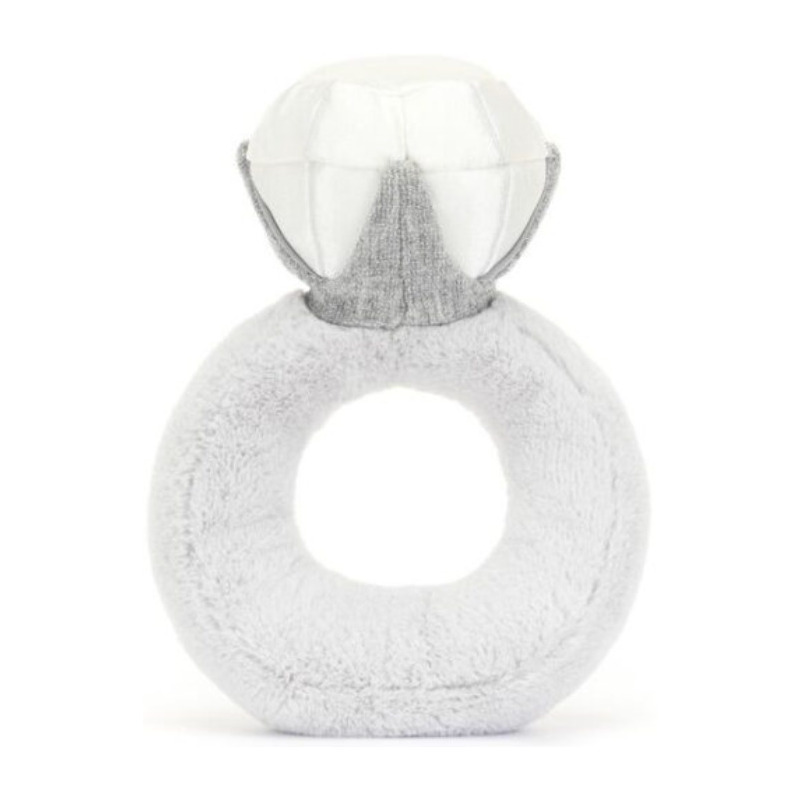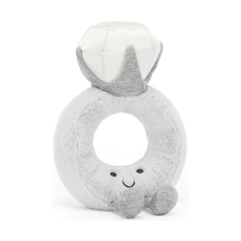 Zabawny Pierścionek z diamentem to bardzo miły i przyjemny w dotyku pluszak. Ma futerko w srebrzystoszarym kolorze, uśmiechniętą buźkę i jedwabisty biały diament oraz urocze dżersejowe stópki gotowe do tańca. Można się z nim bawić i przytulać!