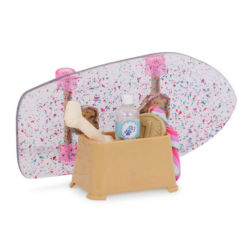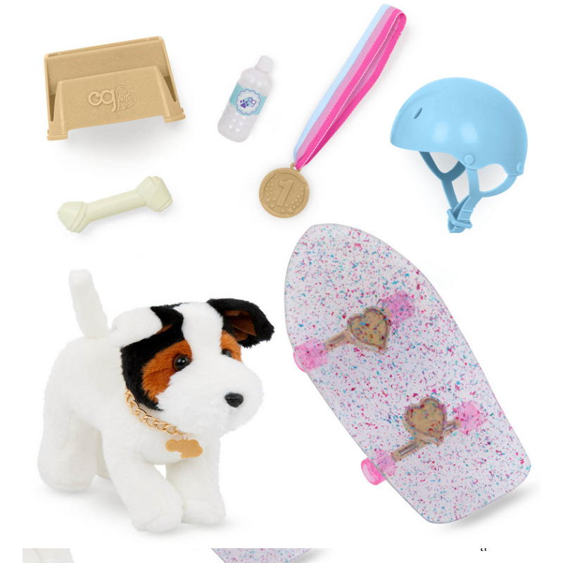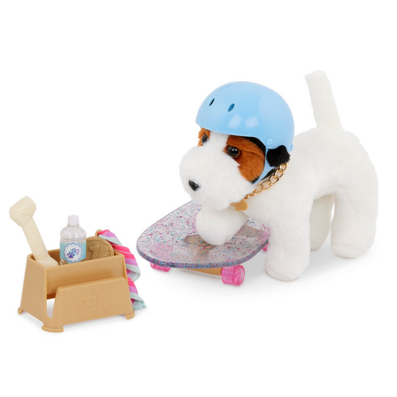 Piesek szczeniaczek z serii Our Generation to prawdziwy skater. Ma ze sobą deskorolkę, kask i inne niezbędne akcesoria,