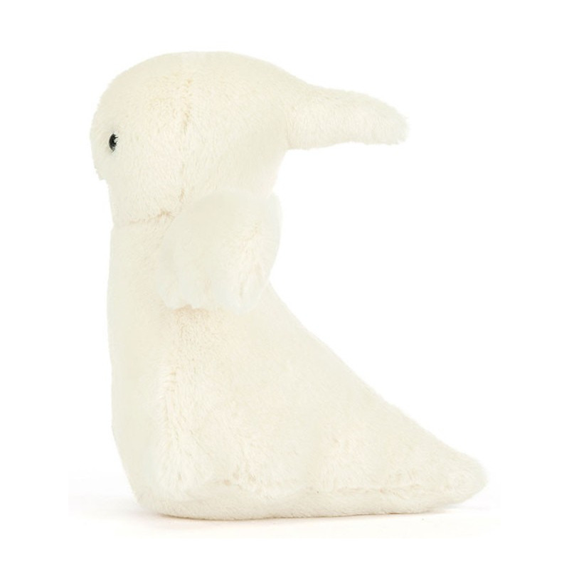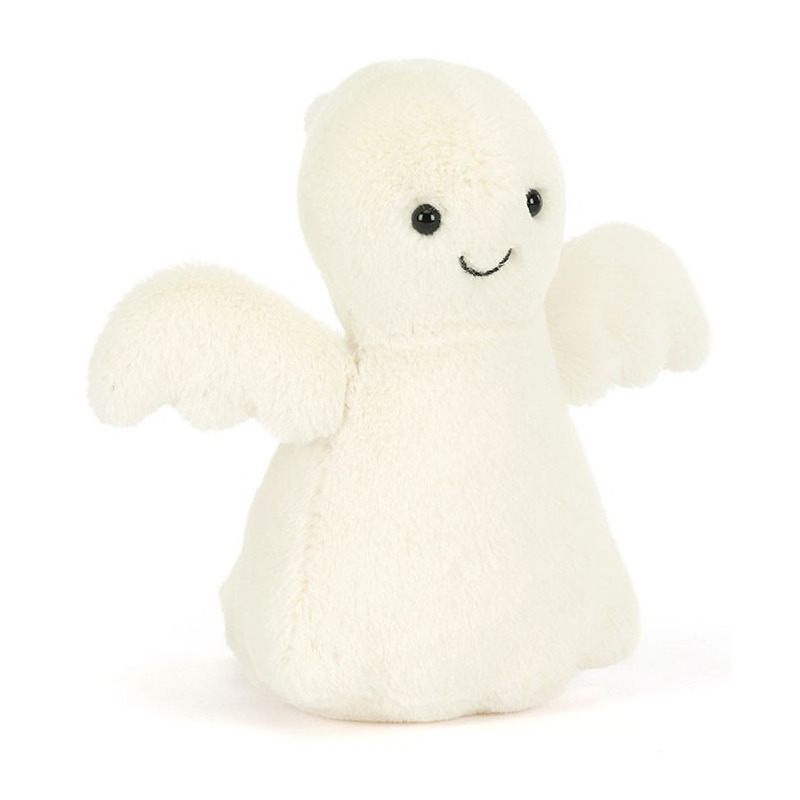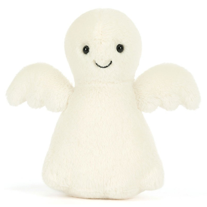Duszek marki Jellycat to bardzo miły i przyjemny w dotyku pluszak. To przeurocze stworzenie ma białe futerko i wesoło się uśmiecha. Będzie świetlnym towarzyszem podczas każdej (nawet lekko strasznej:)) przygody Malucha!