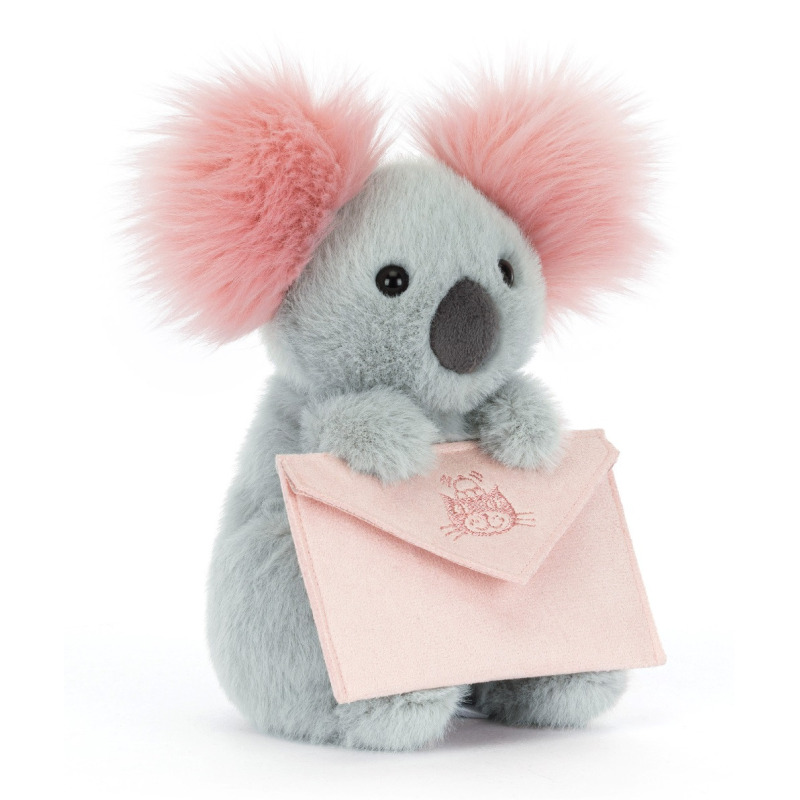 Ta urocza Koala to prawdziwy listonosz miłości! Mięciutkie, szare futerko, puszyste różowe uszka i różowa koperta trzymana w łapkach sprawiają, że wygląda jak ambasador czułych wiadomości. W środku koperty znajduje się mała kartka, którą możesz spersonalizować — idealna, by przekazać komuś wyjątkowe słowa prosto z serca.