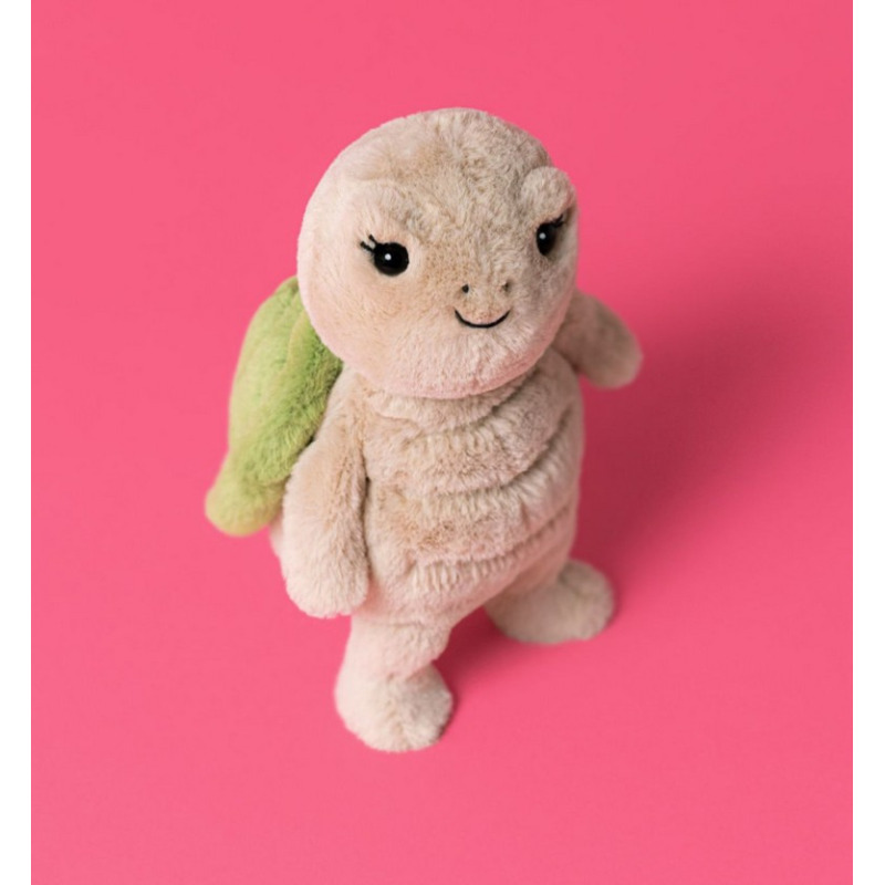 Żółwica Thimble marki Jellycat to młodsza siostra Timmy’ego – pełna energii i iskry. Ten uroczy gad ma mięciutką zieloną skorupę oraz beżowy brzuszek i łapki. Można się z nimą bawić i przytulać!