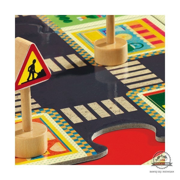 Zestaw zawiera: 24-elementowe puzzle i 5 drewnianych znaków drogowych