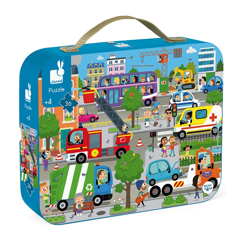 Zestaw puzzli w walizce Miasto francuskiej marki JANOD składa się z 36 poręcznych elementów, po ułożeniu tworzących piękny obrazek, przedstawiający ruchliwą ulicę w centrum miasta. Pełno tu interesujących pojazdów, m.in. dźwig, piętrowy autobus, wóz strażacki, którego ekipa właśnie gasi pożar w kamienicy, laweta, śmieciarka czy ambulans.