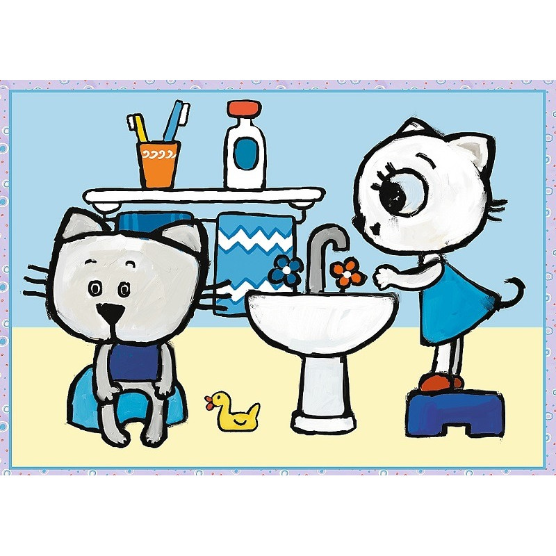 Po ułożeniu otrzymamy cztery obrazki różnej wielkości przedstawiające wydarzenia z dnia Kici Koci i Nunusia.