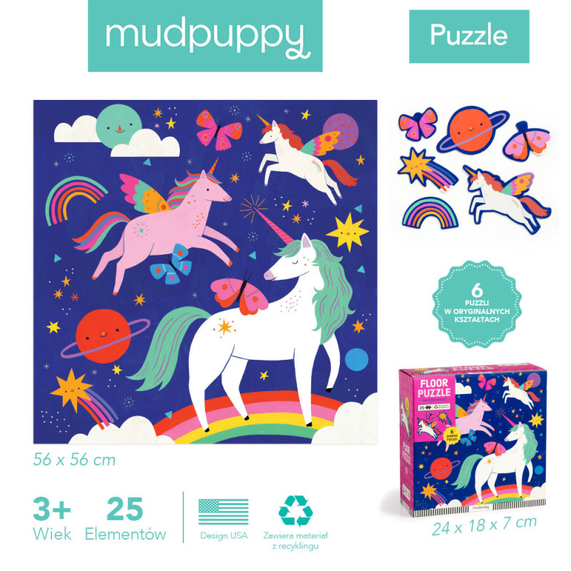Zestaw puzzli podłogowych Magiczne jednorożce marki MUDPUPPY składa się z 25 bardzo dużych, łatwych do układania elementów, w tym 6 elementów specjalnych w unikatowych kształtach, a są to: dwa motyle, planeta, kometa, tęcza oraz jednorożec. Ułożony z nich sporych rozmiarów (56 x 56 cm) obrazek przedstawia jednorożce w kosmosie. Układankę można wykorzystywać do snucia opowieści o tych magicznych stworzeniach.
