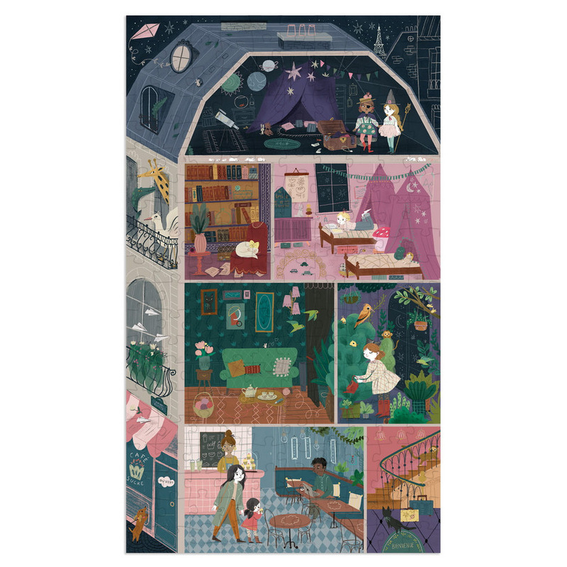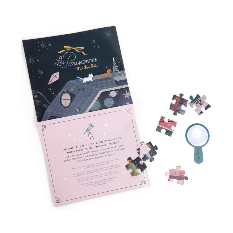 Puzzle obserwacyjne 200 elementów z kolekcji Les Parisiennes, przedstawiające wnętrze paryskiej kamienicy i jej mieszkańców podczas codziennych zajęć. Po ułożeniu za pomocą dołączonego szkła powiększającego odszukujemy zwierzęta i przedmioty ukryte na obrazku. Autorką pięknych ilustracji na puzzlach jest Lucille Michieli.
