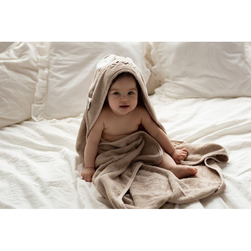 Ręcznik posiada urocze uszka i haft na kapturku, z tyłu natomiast funkcjonalną szelkę na szyję rodzica, ułatwiającą codzienną pielęgnację.