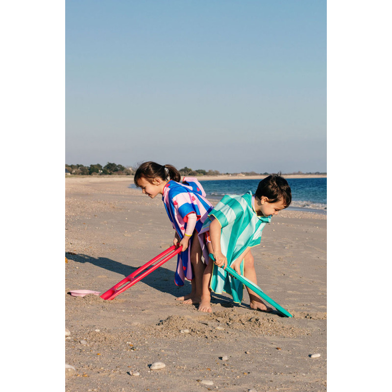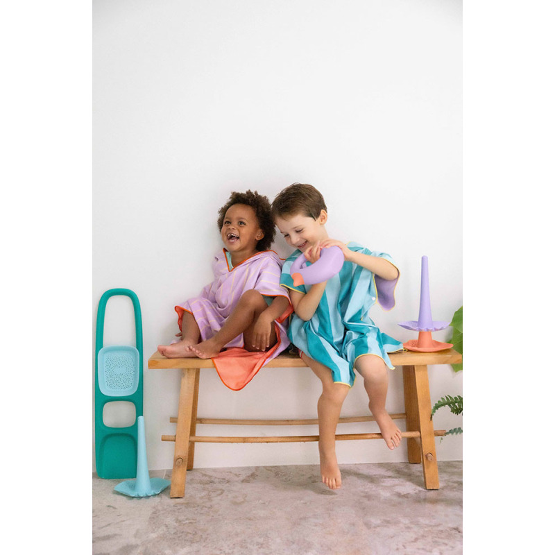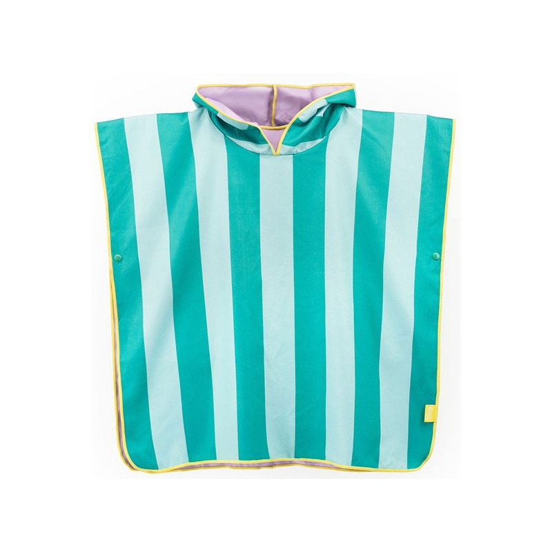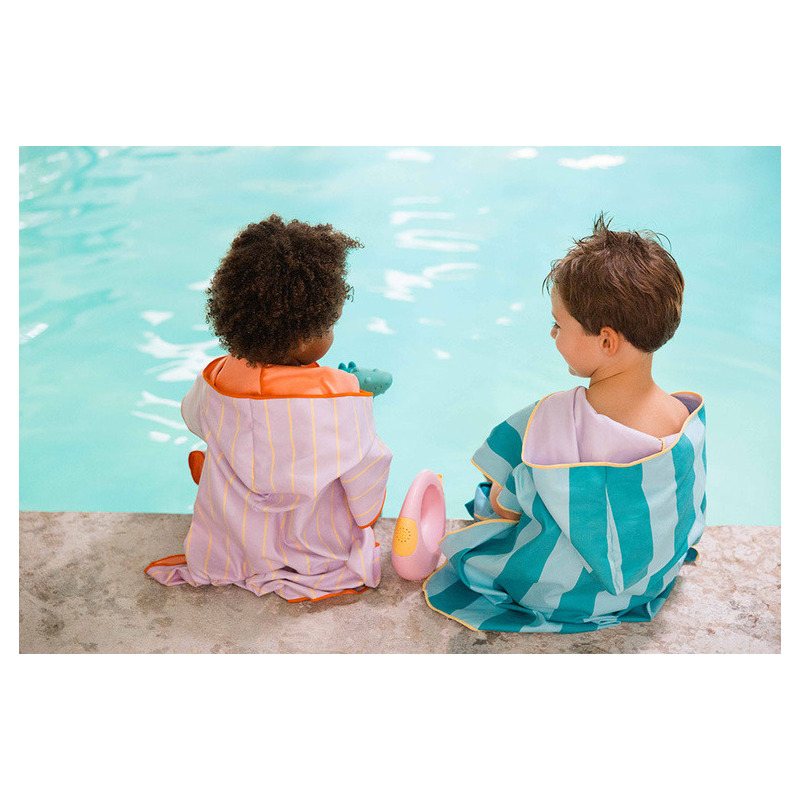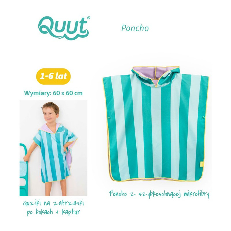 Dwustronne poncho z mikrofibry Lagoon marki Quut to praktyczne rozwiązanie dla aktywnych dzieci w wieku od 1 do ok. 6 lat. Sprawdzi się jako szybkoschnący ręcznik z kapturkiem po rozrywce w wodzie lub ubranko na plażę (nie absorbuje piasku), basen czy po kąpieli w domu. Jest przyjemne w dotyku i dwustronne: lawendowe po jednej, w szerokie jasno i ciemno turkusowe pasy po drugiej stronie. Ma pętelkę do zawieszenia np. na haczyku i zapięcie na napy pod pachami. Zachwyca niebanalnym designem i zachęca do aktywności.